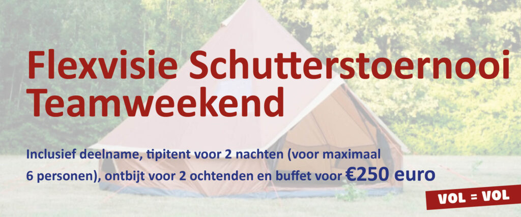 Wil jij samen met je vrienden/team meedoen aan het FlexVisie Open Schutterstoernooi en er een geweldig weekend van maken? Dat komt goed uit, want vanaf dit jaar kun je bij ons een volledig arrangement boeken voor maximaal 6 personen. Samen overnacht je in een grote tent, inclusief ontbijt, avondeten en deelname aan het toernooi.